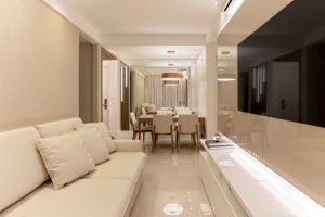O imóvel conta com seis cômodos, sendo eles sala, cozinha, dois quartos e dois banheiros. A sala, que tem o maior espaço do local, ganhou uma decoração aconchegante, com elementos em cores suaves, como o branco e o bege, além de utilização de uma boa iluminação, que ajudou a transmitir ao ambiente conforto e sensação de amplitude.